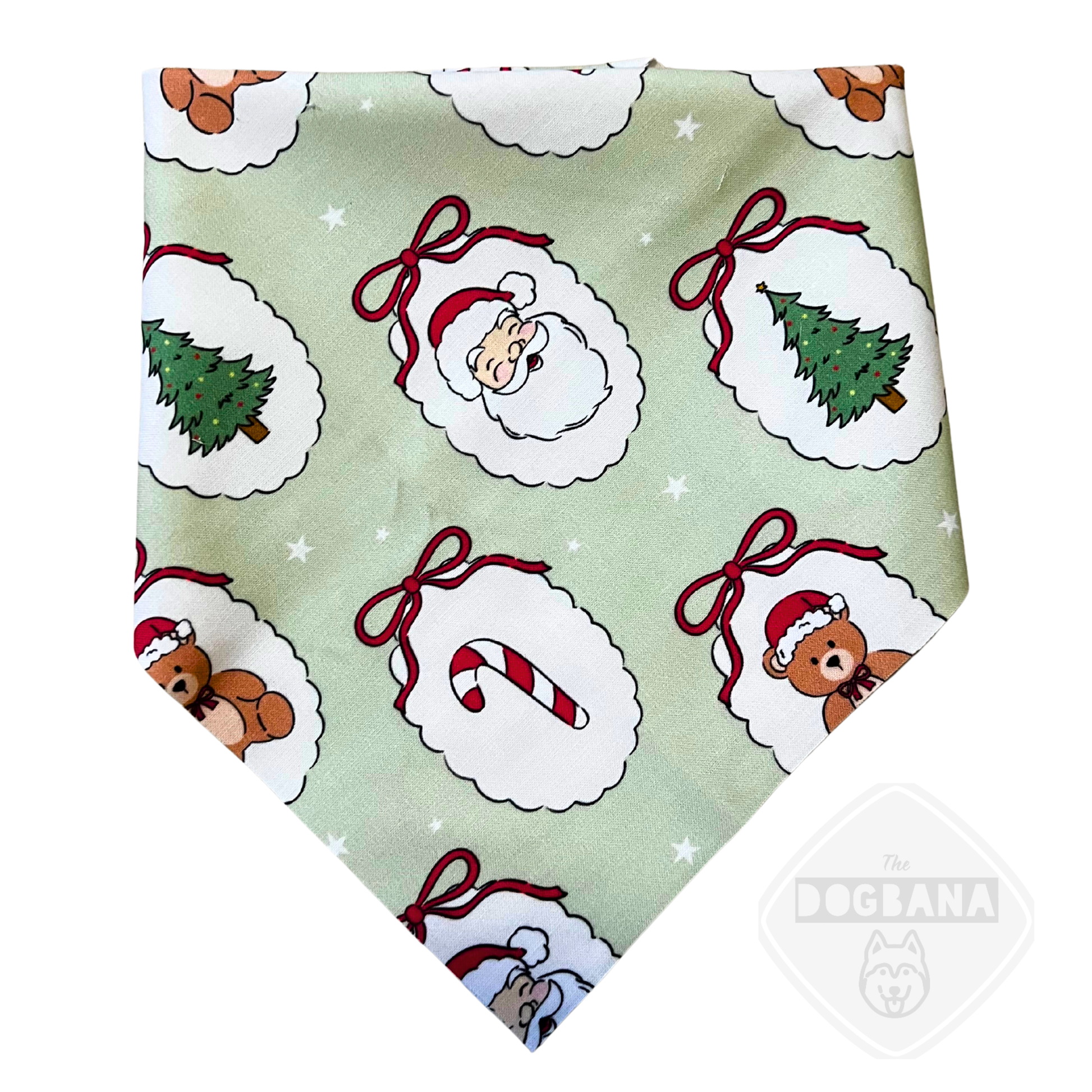 This bandana is perfect for any occasion including fun holiday photos! Pattern is a mint green with Christmas ornaments all over.